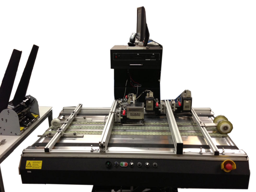 Controller BK700, Inkjet Software Compose 6.06 fuer Windows, Streamfeeder V-710IJ, Höhenverstellbarer Vakuumtisch (HVT), 1 Elite-Druckkopf (Wachs-Jet, 600 dpi, Baujahr 2009), 3 HP-Druckköpfe (Wasser-Jet, 600 dpi), Ablageband