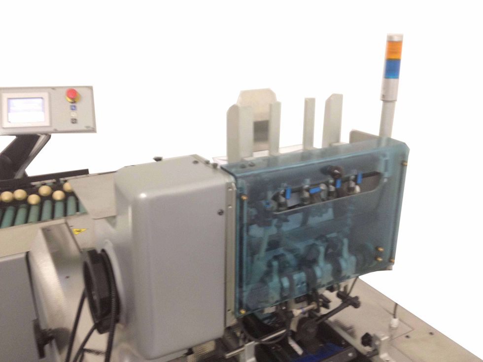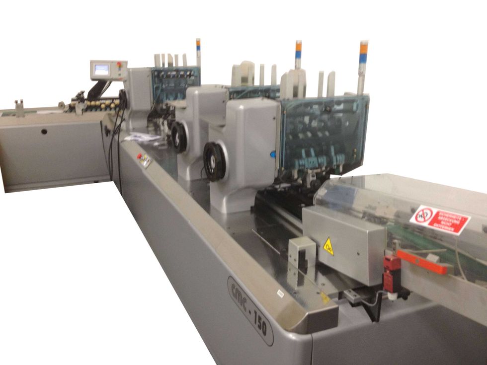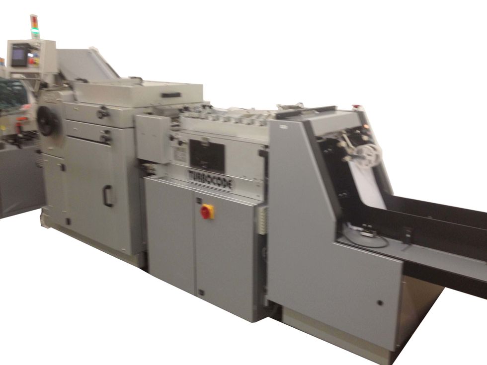 Komponenten: Autoloader, Turbo Einzelblattanleger, Falzmodul, 4-Stationen-Basis, 2 Rundbogenanleger (Flip Flop-Betrieb), Aussteuerfach,