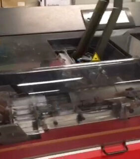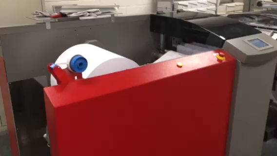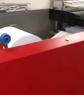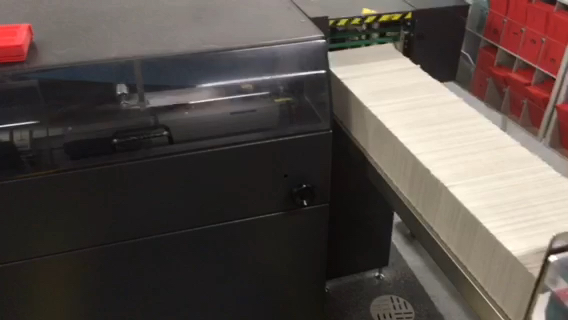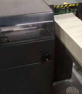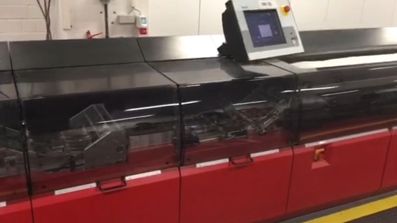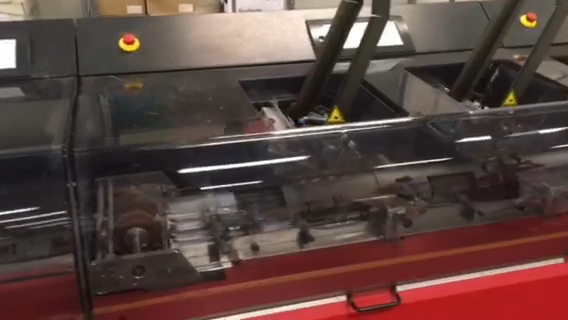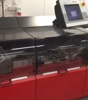 Komponenten: Abroller Kern 100, Teilbahnseparator K945, Pinless Schneider K995, Gruppier- und Falzmodul, 4 Beilagenstationen, 2 Aussteuerfächer, Vertikal-Ablage