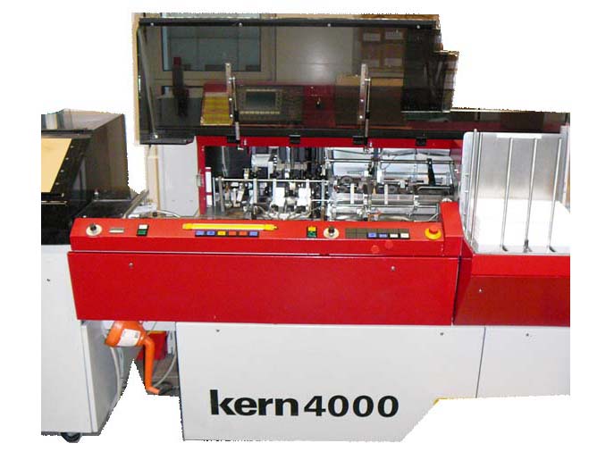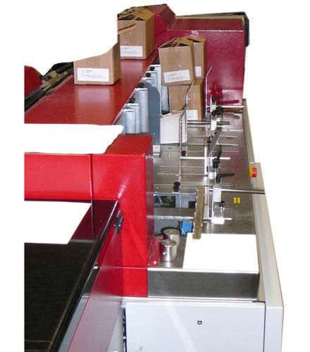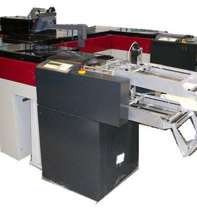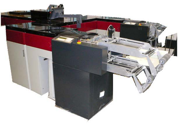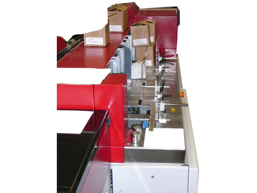 Komponenten: 4 Beilagenstationen mit Lesung, Ablageband mit drei Aussteuerfaechern, Hefter, Briefwender mit Frankierung, 2 Endlosformularschneider, 4 Gruppiermodule
